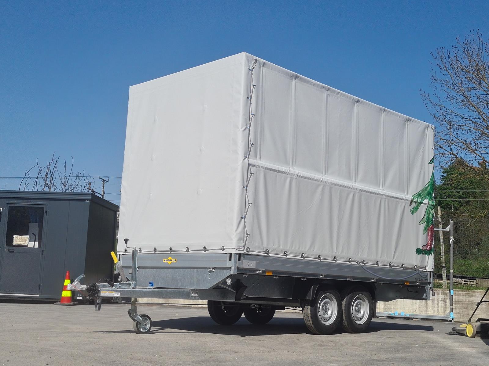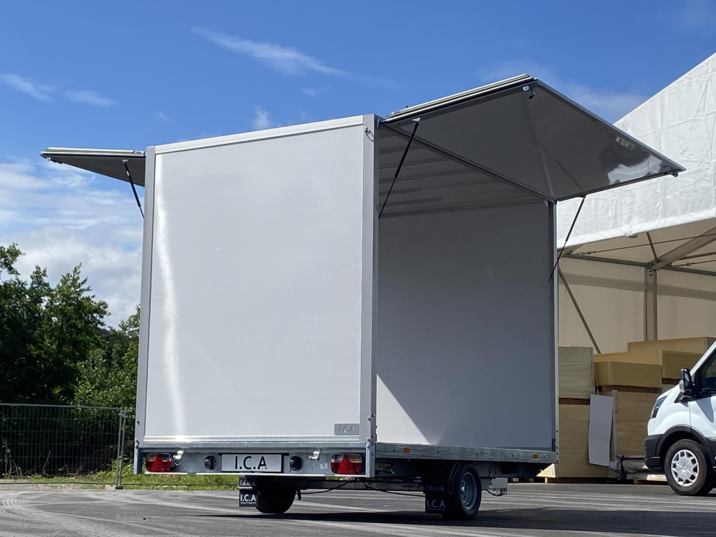 Bis zu einem Gesamtgewicht von 3500 kg, mit unterschiedlichen Abmessungen und verschiedenen Öffnungssystemen. Zur Auswahl stehen Anhänger mit Seitbordwänden, zweiflügeligen Hecktüren, Planen sowie diversen Öffnungsarten: Rollplane, Vorhangplane, seitlich öffnende Klappen mit Gasdruckdämpfern.